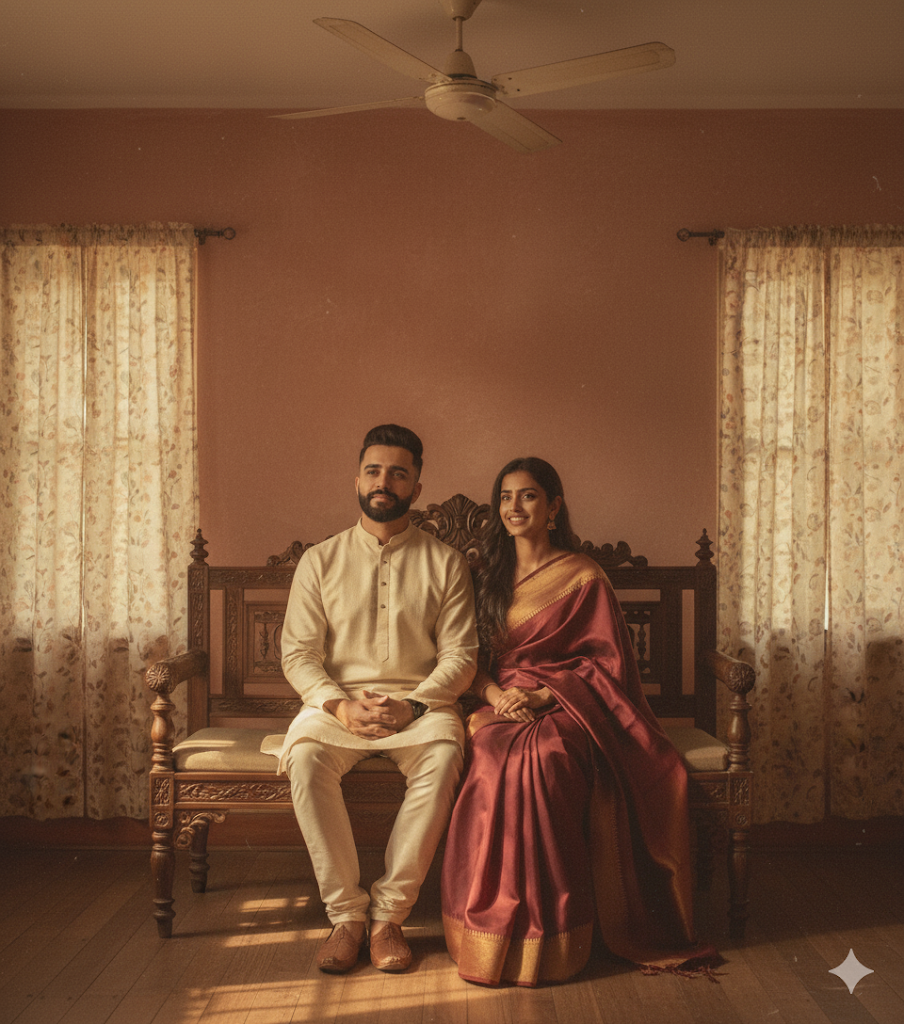 “A young couple seated on wooden chairs facing slightly toward each other in a sparse interior. The man wears a navy kurta with rolled sleeves, and the woman, in a muted lavender saree with silver accents, tilts her head gently toward him. A single shaft of sunlight cuts across the room, leaving parts of their faces in shadow. The mood is cinematic, with warm, grainy tones recalling analog film photography. The face must remain exactly the same as in the provided reference photo, with no alterations.”
