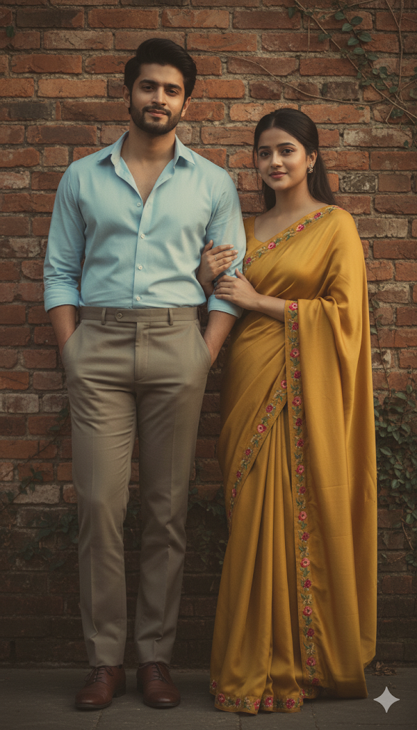 “A charming couple standing in front of a rustic brick wall, bathed in golden evening sunlight. The man wears high-waisted trousers and a tucked-in pastel shirt, his hair combed neatly. The woman, in a mustard yellow saree with a delicate floral border, gently holds his arm while smiling faintly. The atmosphere feels timeless and cinematic, with muted vintage film colors and a sense of quiet nostalgia. The face must remain exactly the same as in the provided reference photo, with no alterations.”