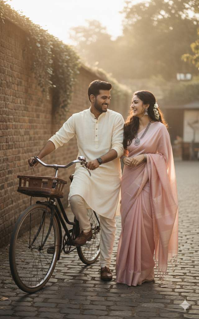 “An elegant couple captured in a candid moment. The man leans against a vintage bicycle, wearing a cream linen kurta, while the woman stands beside him in a soft pink saree with a subtle sheen. Her hair is styled in loose waves, with a jasmine garland woven into it. They both share a gentle laugh, illuminated by the warm glow of the late afternoon sun, giving the scene a 1980s hand-tinted photograph feel. The face must remain exactly the same as in the provided reference photo, with no alterations.”