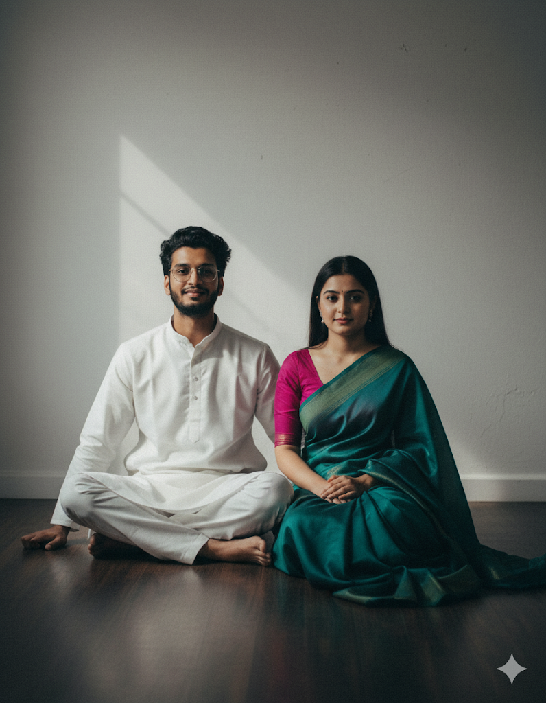 “A poised couple sitting cross-legged on the floor of a minimally decorated living room. The man wears a simple white cotton kurta, and the woman wears a teal saree with a contrasting magenta blouse. Their posture is calm, almost regal, as they look directly at the camera. The photograph has slightly desaturated colors, subtle film grain, and dramatic natural light entering from one window, evoking the style of 1970s Indian studio portraiture. The face must remain exactly the same as in the provided reference photo, with no alterations.”