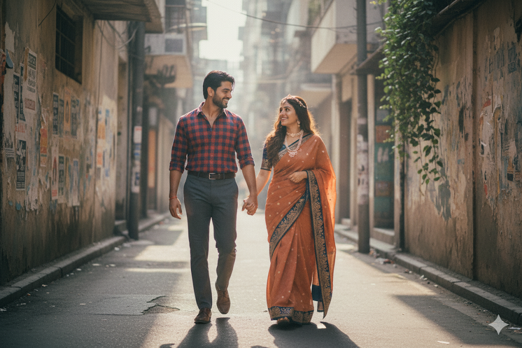 “A romantic image of a couple walking hand in hand through a narrow alleyway with old painted walls and faded posters. The man wears a checkered shirt tucked into trousers, while the woman wears a rust-orange saree with a contrasting dark border. Their shadows stretch behind them under the strong afternoon sun, adding drama. The style is reminiscent of candid 1980s street photography with soft focus and subdued colors. The face must remain exactly the same as in the provided reference photo, with no alterations.”