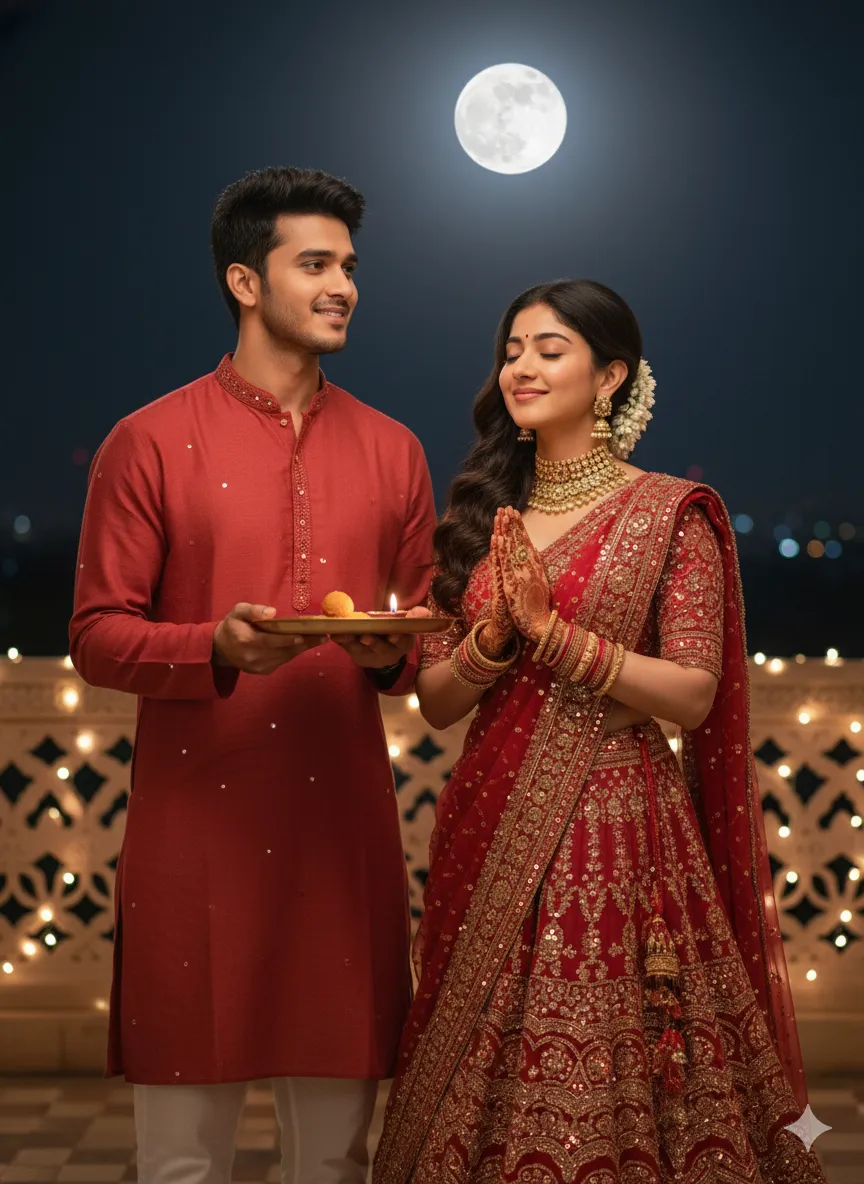 A beautiful Indian couple celebrating Karva Chauth under the full moon. The woman, in a red silk saree with golden embroidery, traditional jewelry, bangles, and mehndi, holds a decorated thali with a diya, sweets, and a copper pot, gazing at her husband through a sieve. The man, in a black velvet sherwani with embroidered details, smiles lovingly at her. Warm string lights, diyas, and the glowing moon create a romantic, festive ambiance.