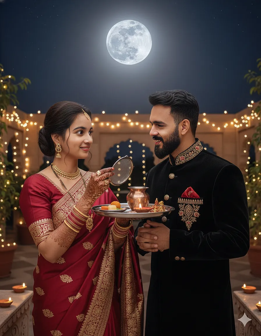 A beautiful Indian couple celebrating Karva Chauth under the full moon. The woman, in a red silk saree with golden embroidery, traditional jewelry, bangles, and mehndi, holds a decorated thali with a diya, sweets, and a copper pot, gazing at her husband through a sieve. The man, in a black velvet sherwani with embroidered details, smiles lovingly at her. Warm string lights, diyas, and the glowing moon create a romantic, festive ambiance.