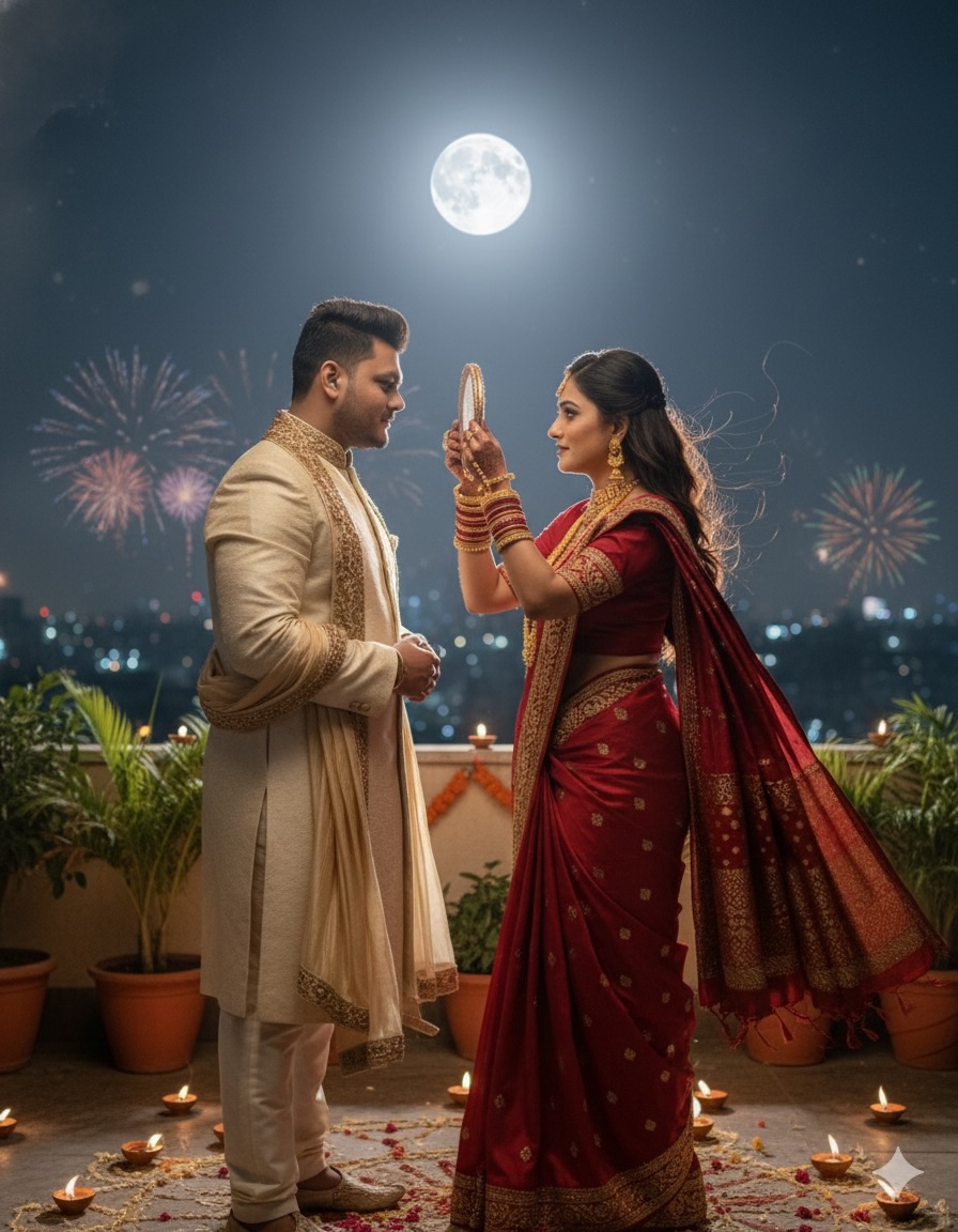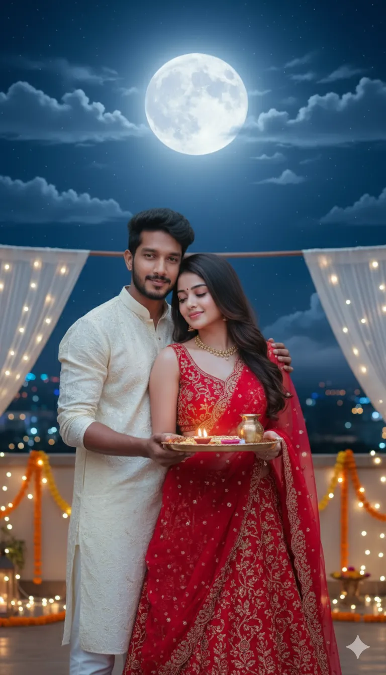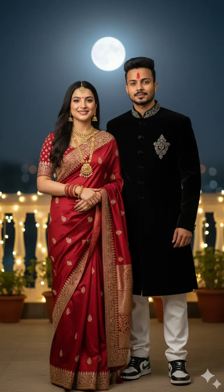 Ultra-realistic 9:16 cinematic portrait of an Indian couple celebrating Karwa Chauth night, both looking at the camera. Wife (same as female reference) in deep red silk saree with golden embroidery, heavy gold jewelry. Husband (same as male reference) in black velvet sherwani with silver embroidery, red tilak, soft smile. Romantic terrace with full moon and warm golden festive lights, 8K ultra HD. 10 Gemini AI Prompts for Karwa Chauth Photos