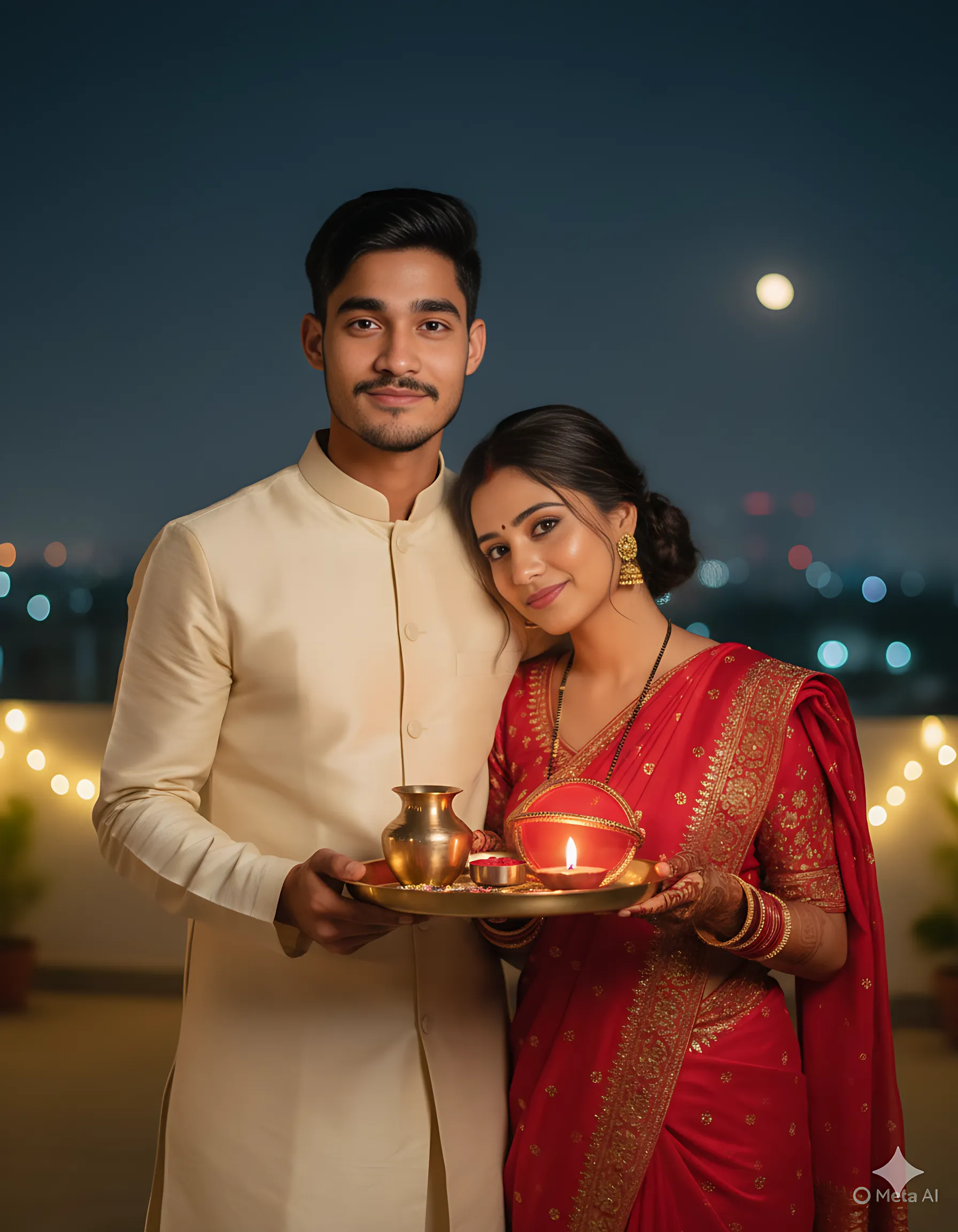 Ultra hyper-realistic 8K DSLR cinematic half-body portrait of a 20-year-old slim-fit Indian couple on a terrace at night, celebrating Karwa Chauth. Couple standing side by side, woman slightly leaning her head on the man’s shoulder, holding the glowing decorated thali with diya and channi , Kalash, Sindoor between them at chest level. Keep the faces exactly the same as the uploaded photos for originality. 10 Gemini AI Prompts for Karwa Chauth Photos