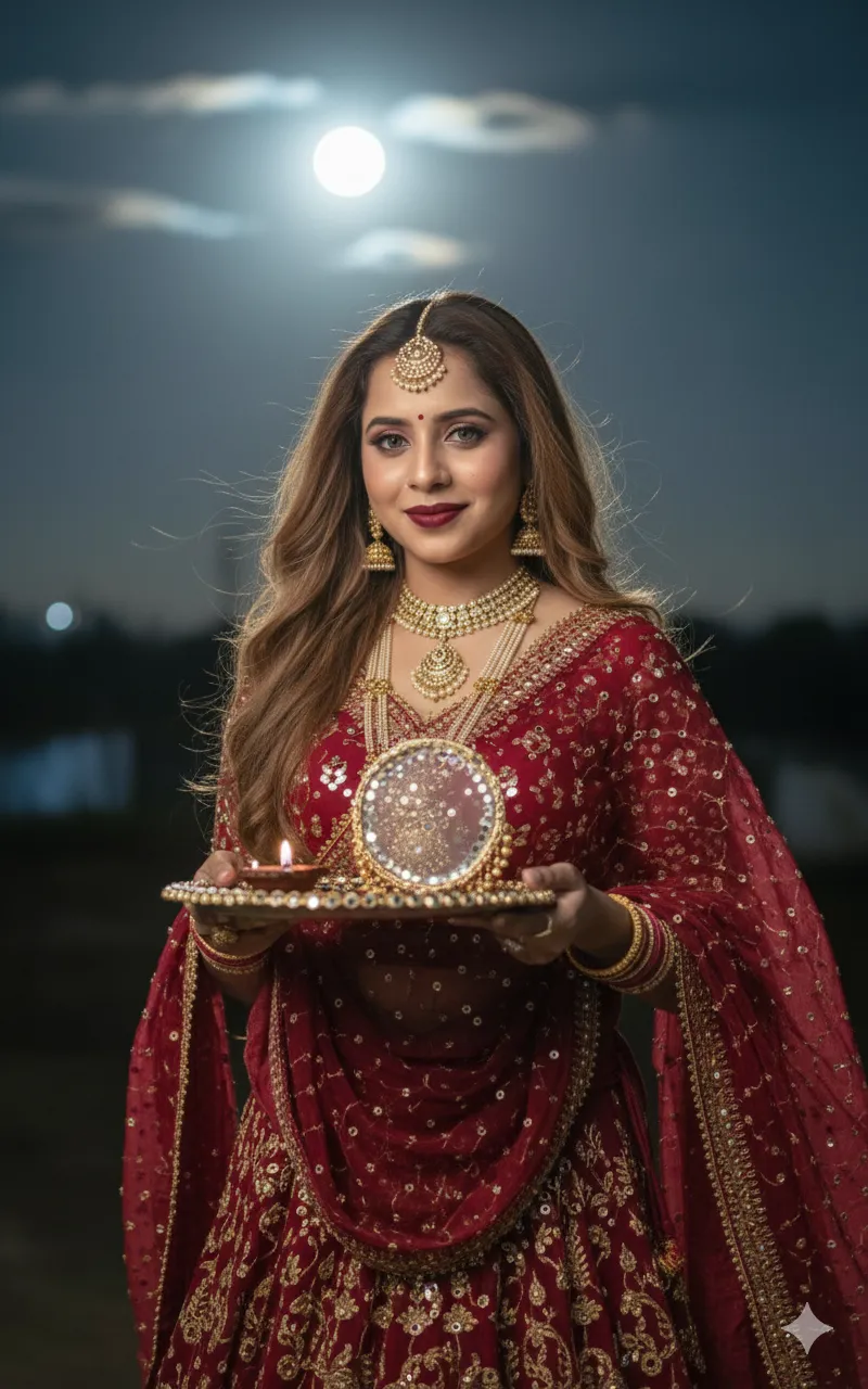 Create a portrait cinematic picture in night moon full background. Ayoung woman face.keep face 100% match with uploaded photo. She wear a dark red golden traditional aesthetic chiffon lehnga with dupatta with small mirror dots move in wind around her. Her he inspired to Hum dil de chuke sanam gold jewellery light brown hair little smile little makeup karva chauth plate holding in hands a Diya and beautiful chalni beautiful mangalsutra 10 Gemini AI Prompts for Karwa Chauth Photos