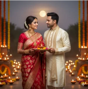 आप सभी को नीचे करवा चौथ के Karwa Chauth Love Prompts दिए गए हैं, जिनका Use करके आप भी अपनी couple photo बना सकते हैं और आप भी इस Karwa Chauth कुछ नया कर सकते हैं और आप भी ऐसी Trading Photo को सोशल मीडिया पर share कर सकते हैं, और साथ ही आप भी अपनी फोटो को Trading Photo में शामिल कर सकते हैं। इसके लिए आपको बस दिए गए Prompt को copy paste करना होगा और कुछ ही सेकंड में आपकी फोटो बनाकर Ready हो जाएगी।