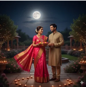 Generate a 4K cinematic full-body image of a couple celebrating Karwa Chauth outdoors. The woman wears a vibrant pink saree with golden borders and the man in a light brown kurta-pajama. Include traditional Karwa Chauth elements like a decorated puja thali, Diya lamps, and a moonlit sky. Capture natural expressions, flowing fabrics, and a warm color palette to evoke the festive mood authentically.10 Gemini AI Prompts for Karwa Chauth Photos