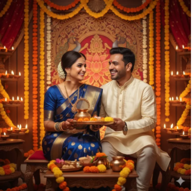 Generate a 4K portrait of a couple in a fully decorated indoor Karwa Chauth setting. The woman wears a royal blue saree with gold embroidery, the man in a cream kurta. Include Diya lamps, floral garlands, and a beautifully decorated puja thali. Capture joyful expressions, subtle festive lighting, and traditional details like bangles, jhumkas, and mehndi patterns to create a vibrant, authentic atmosphere.10 Gemini AI Prompts for Karwa Chauth Photos