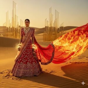 Hyper-detailed, ultra-realistic 8K cinematic fashion editorial of a woman in a red and gold bridal lehenga covered in intricate mirror-work and shimmering zardozi embroidery. Her flowing dupatta transforms into molten silk fire, blending into the horizon. Jewellery: layered temple necklaces and glowing bangles that emit faint divine light. Dramatic desert atmosphere, golden hour cinematic lighting.