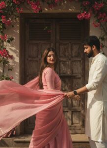 Create a retro vintage grainy but bright mage of the reference picture but draped in perfect brown Pinteresty aesthetic retro saree for girl and suite for boy. It must feel like a 90s movie brown hair baddie with A small ower tuck visibly in the curls and windy environment romanticising for girl. The girl nd boy is standing against a solid wall deep shadows and contrast drama, creating a hysterious and artistic atmosphere.
