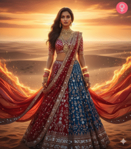 Hyper-detailed, ultra-realistic 8K cinematic fashion editorial of a woman in a red and Blue bridal lehenga covered in intricate mirror-work and shimmering zardozi embroidery. Her flowing dupatta transforms into molten silk fire, blending into the horizon. Jewellery: layered temple necklaces and glowing bangles that emit faint divine light. Dramatic desert atmosphere, golden hour cinematic lighting.