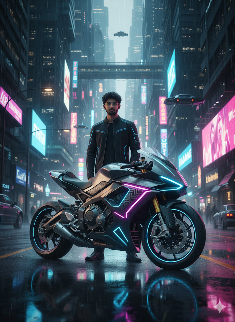 “Neon bike in cyberpunk city, glowing streets, futuristic reflections, AI-enhanced realism”